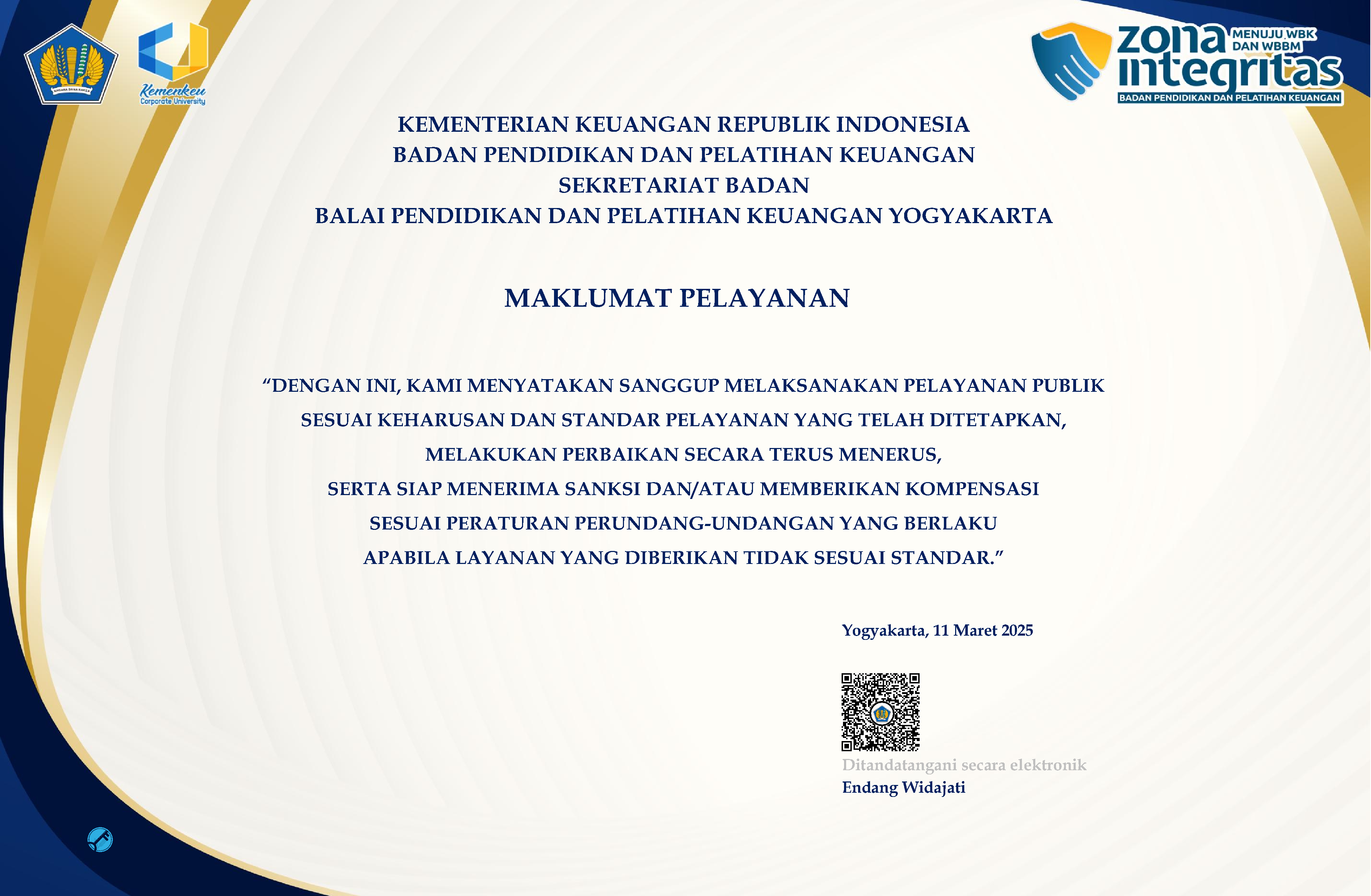 Balai Pendidikan dan Pelatihan Keuangan Yogyakarta berkomitmen dan menyatakan sanggup melaksanakan pelayanan publik sesuai keharusan dan standar pelayanan yang telah ditetapkan, melakukan perbaikan secara terus menerus, serta siap menerima sanksi dan/atau memberikan kompensasi sesuai peraturan perundang-undangan yang berlaku apabila layanan yang diberikan tidak sesuai standar.